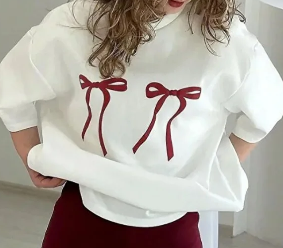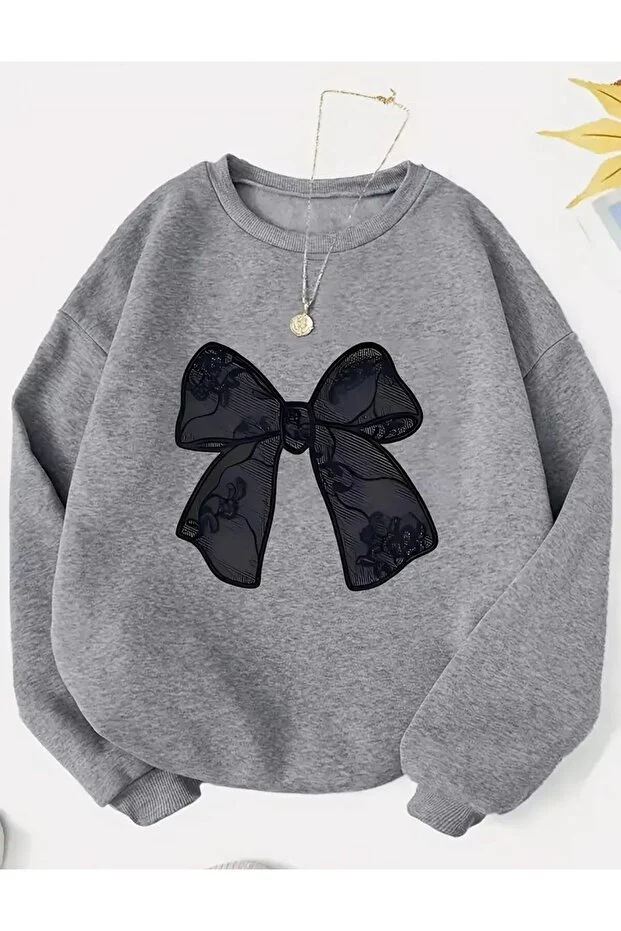 سويت شيرت رمادي بأكمام سوداء مزينة بشريط وقوس من كاديكومبين للنساء