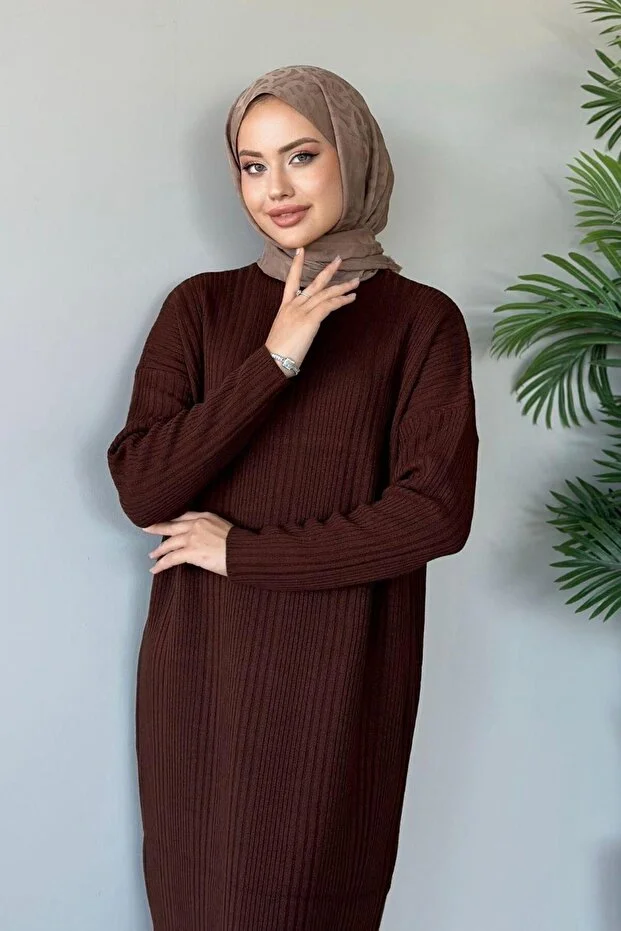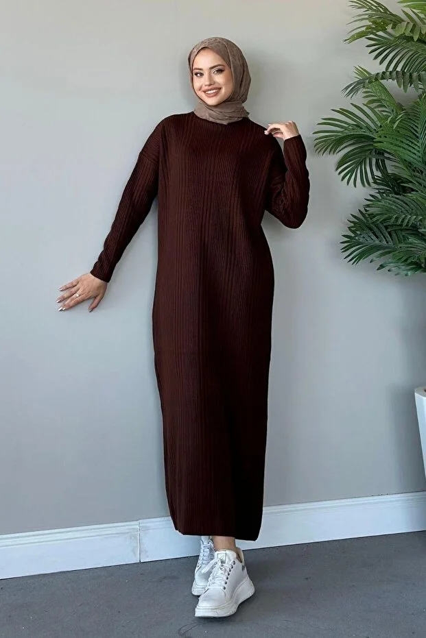 0 Review Of Product Şule Giyim فستان منسوج مضلع بني