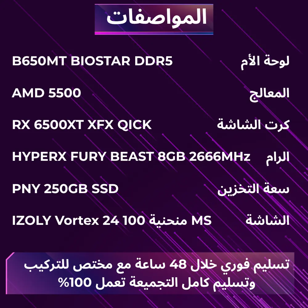 تجميعة لمحبي الألعاب لوحة الأم B550MT BIOSTAR DDR5 المعالج AMD 5500 كرت الشاشة RX 6500XT XFX QICK 8GB 3200MHz سعة التخزين PNY 250GB SSD الشاشة IZOLY Vortex 24 منحنية 100 MS