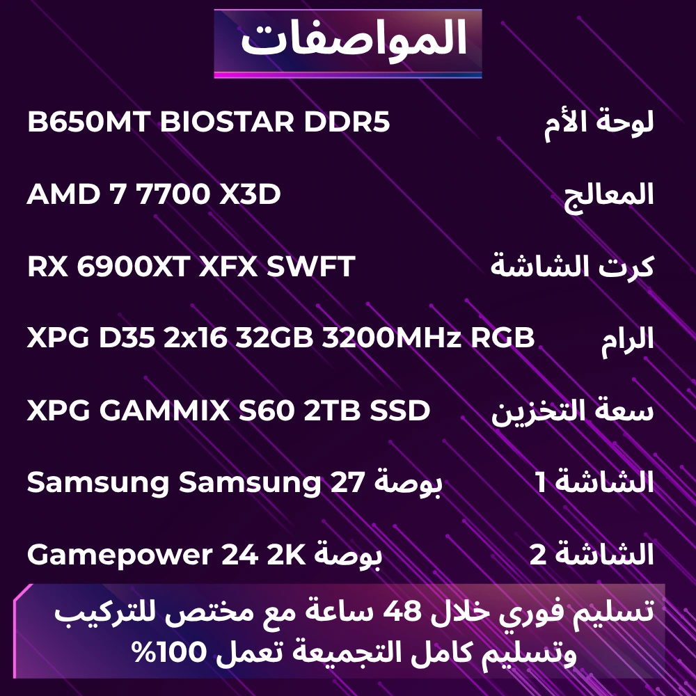 تجميعة لمحبي الألعاب لوحة الأم B650MT BIOSTAR DDR5 المعالج AMD 7 7700 X3D كرت الشاشة RX 6900XT XFX SWFT XPG D35 2x16 32GB 4800 RGB سعة التخزين XPG GAMMIX S60 2TB SSD الشاشة 1 Samsung Samsung 27 بوصة الشاشة 2 Gamepower 24 2K بوصة