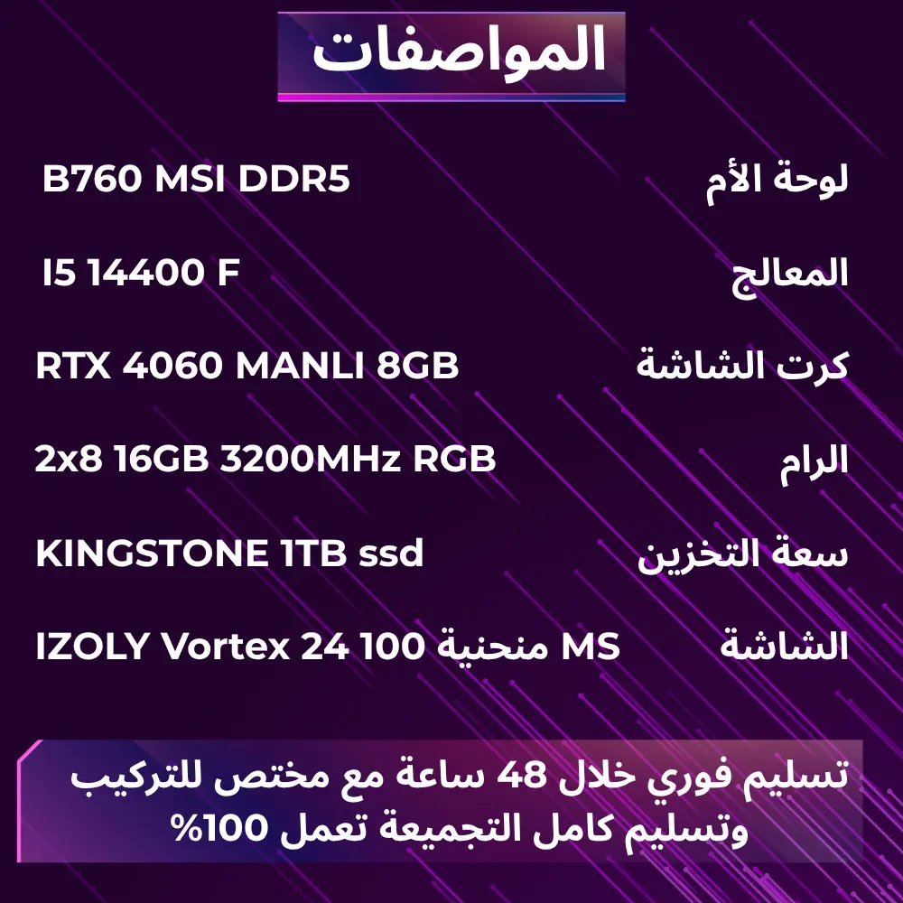 تجميعة لمحبي الألعاب لوحة الأم B760 MSI DDR5 المعالج I5 14400 F كرت الشاشة RTX 4060 MANLI 8GB الرام 2x8 16GB 4800 RGB سعة التخزين KINGSTONE 1TB ssd الشاشة IZOLY Vortex 24 منحنية 100 MS