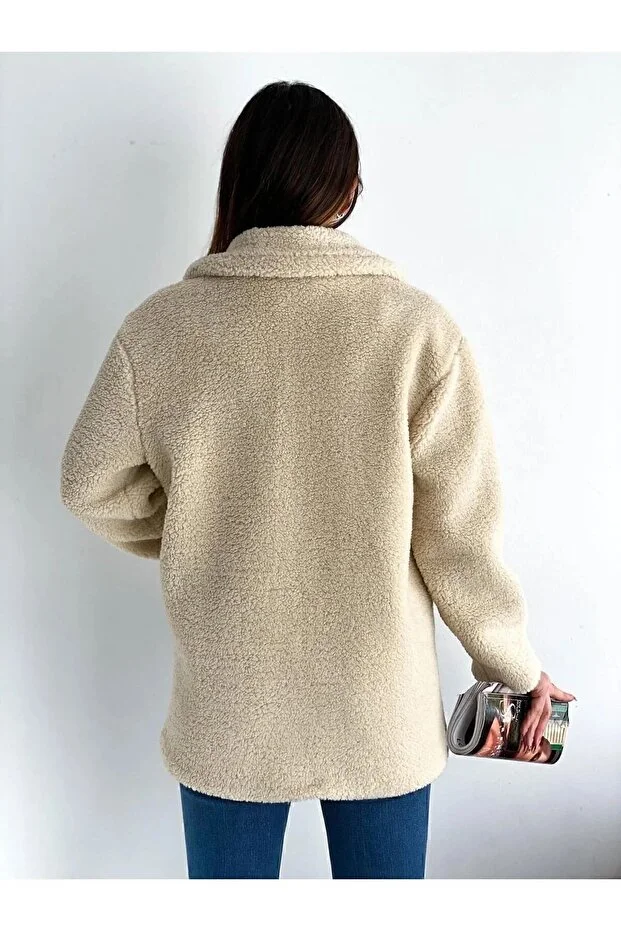 يعتمد التصميم على نسيج بلوشي منسوج متوسط السماكة يمنح ملمساً مريحاً دون بطانة داخلية، مما يجعلها خياراً مثالياً للطقس المعتدل. كما يأتي الإغلاق الأمامي بأزرار لإطلالة كلاسيكية وعملية، إضافة إلى جيبين أماميين يضيفان لمسة استخدامية أنيقة.