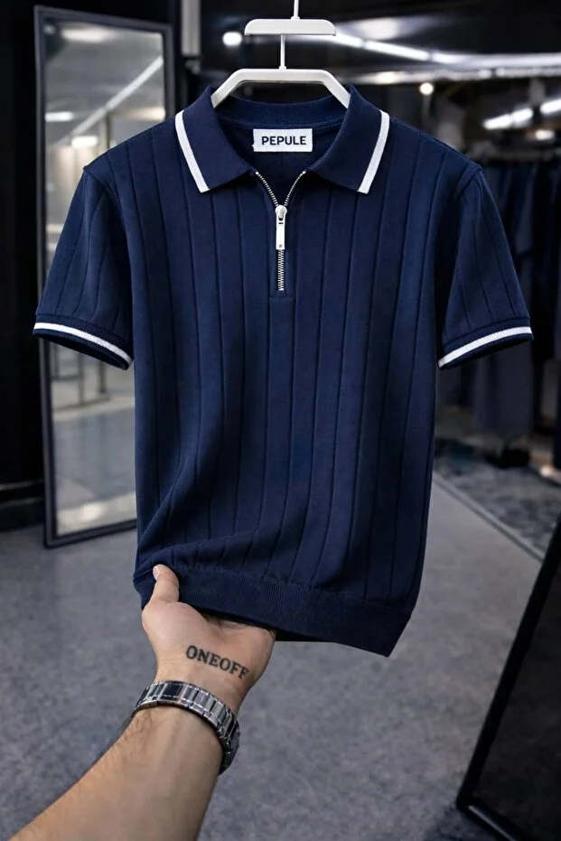تيشيرت رجالي من بيبول، أزرق داكن، بياقة بولو، محبوك، بنمط مميز، بنصف سحاب، مصنوع من القطن العادي