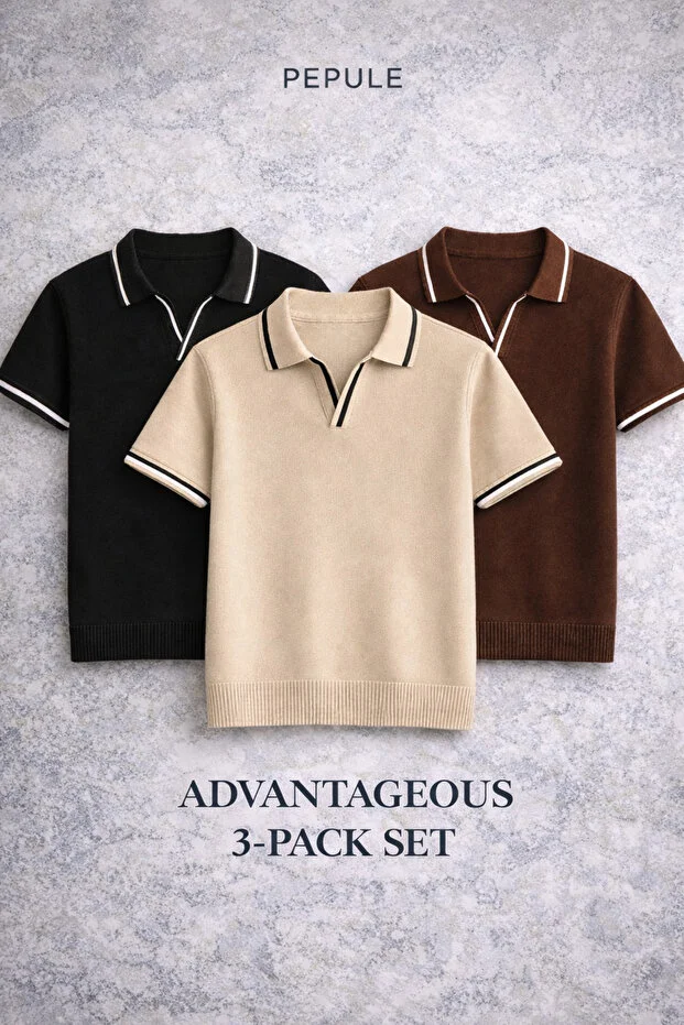 تيشيرت رجالي من بيبول، بياقة بولو ثلاثية الخطوط، مصنوع من القطن المحبوك ذي الملمس العادي متعدد الألوان