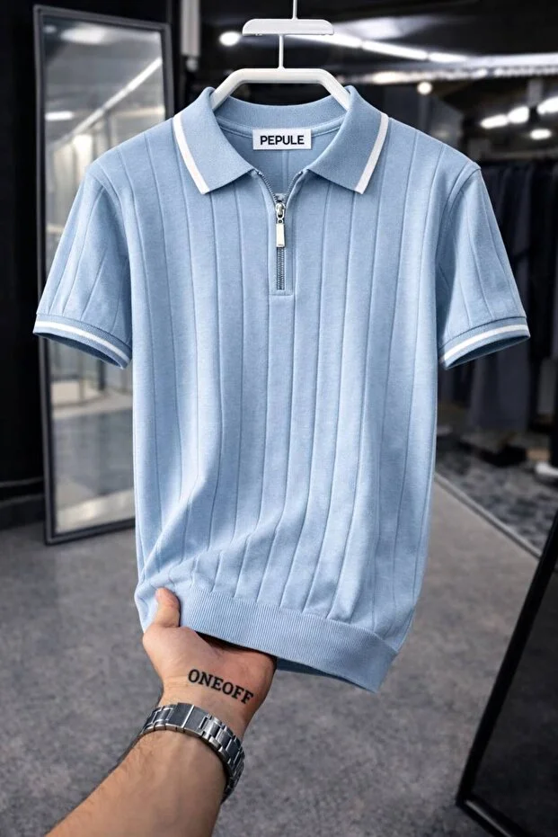 تيشيرت رجالي من بيبول بياقة بولو محبوكة بنمط مميز بسحاب نصفي وقصة عادية من القطن