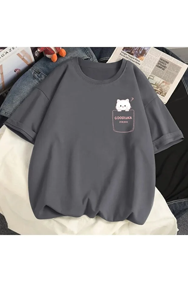 تيشيرت نسائي برقبة دائرية مطبوع عليه صورة قطة من شركة DAXIS للملابس الرياضية