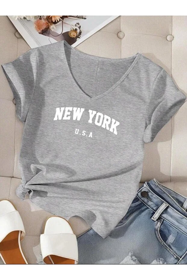 تيشيرت نسائي مطبوع عليه رسومات متنوعة بياقة على شكل حرف V من ماركة FAVORIST