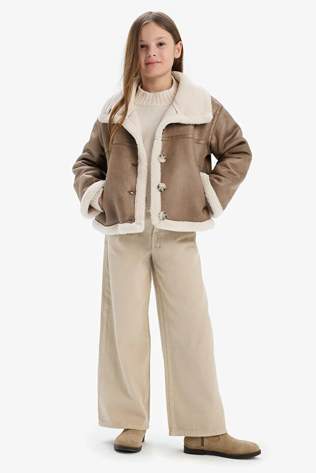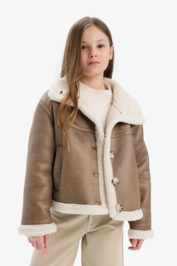 جاكيت/معطف بناتي مقاوم للماء بياقة كبيرة وبطانة مخملية وأزرار C4979A824AU