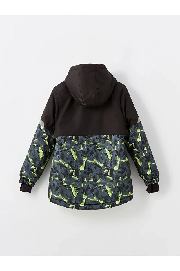 جاكيت تزلج أسود مطبوع عليه شعار LC Waikiki LCW للأطفال، مزود بغطاء رأس وتفاصيل عاكسة للضوء، للأولاد