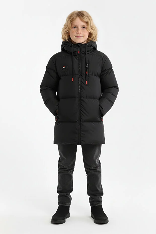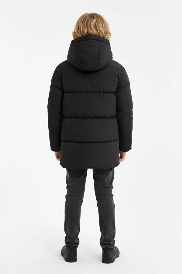 0 Review Of Product جاكيت شتوي أسود خفيف الوزن مقاوم للرياح للأولاد من ريفيركلوب، مزود بغطاء رأس وبطانة من الألياف السوداء.