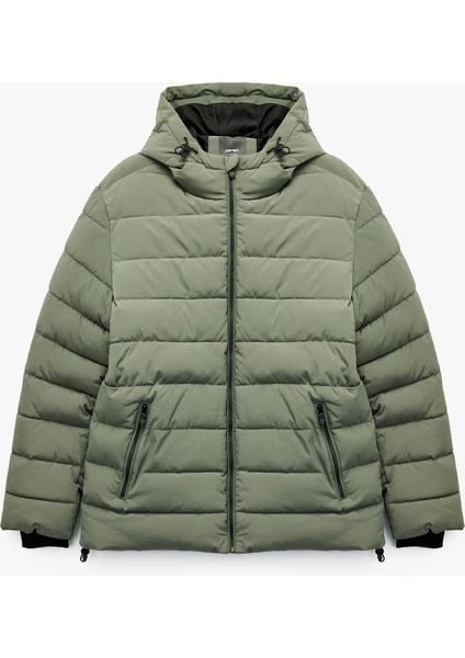 جاكيت شتوي منفوخ بسحاب أمامي، مصنوع من القطن، مزود بغطاء رأس وأكمام طويلة وجيوب