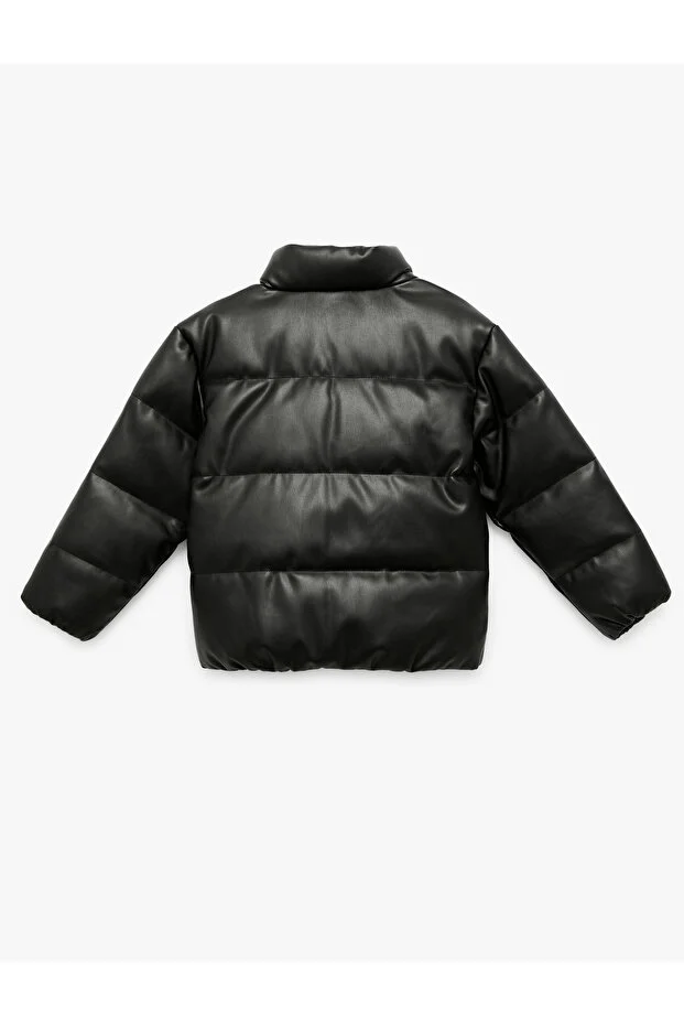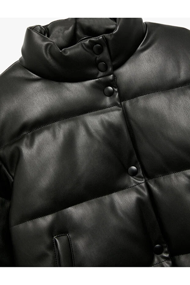 جاكيت كوتون منفوخ من الجلد الصناعي بأكمام طويلة وياقة واقفة وجيوب