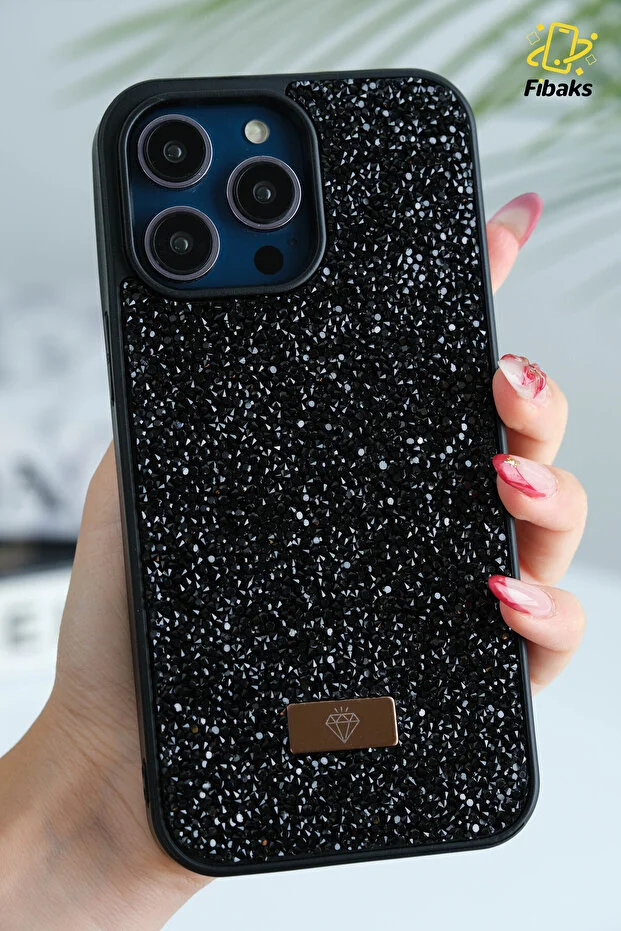 جراب فيباكس لهاتف Apple iPhone 15 Pro Max من السيليكون المخملي بتصميم ماسي أسود لامع من حجر الماس