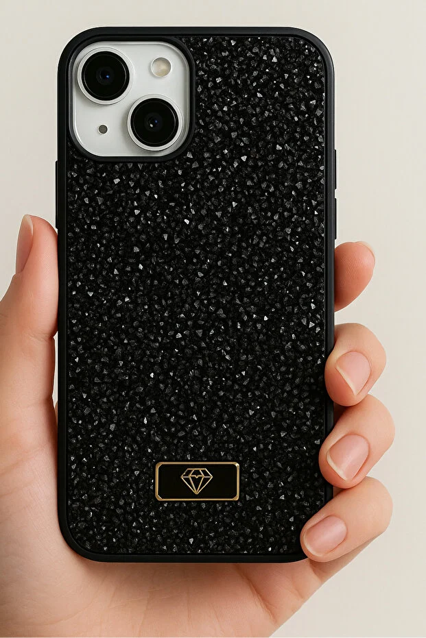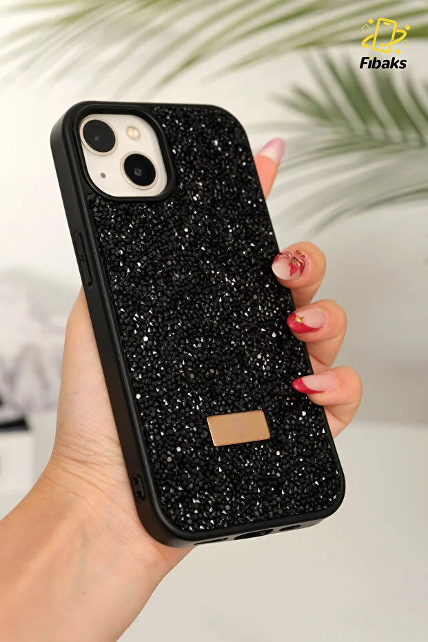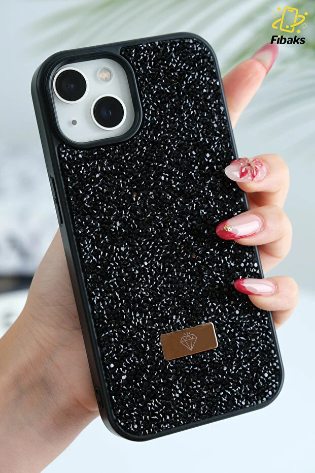 جراب متوافق مع أجهزة iPhone 13 - 14 - 15 بتصميم مخملي ماسي من حجر أسود لامع من السيليكون
