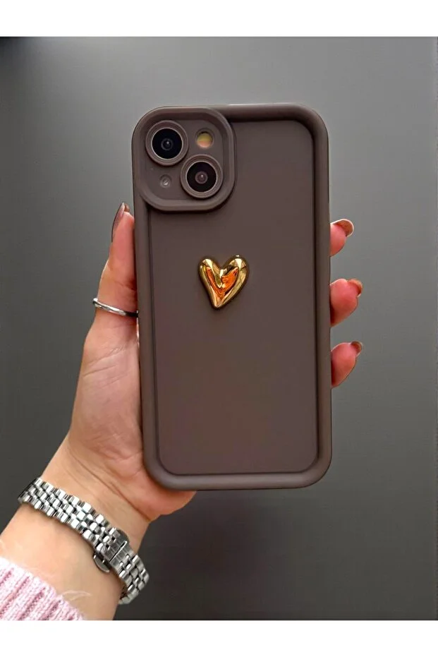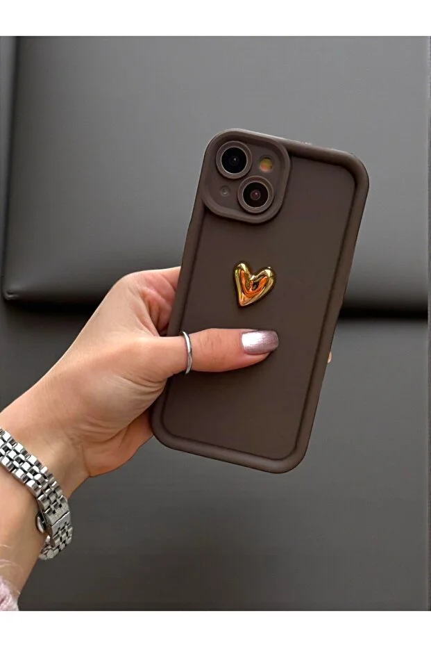 جراب KVK PRIVACY متوافق مع iPhone 15، غطاء حماية ناعم مقاوم للصدمات على شكل قلب ذهبي ثلاثي الأبعاد، لون القهوة