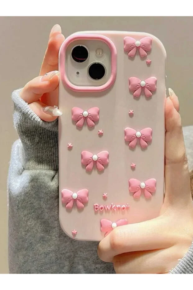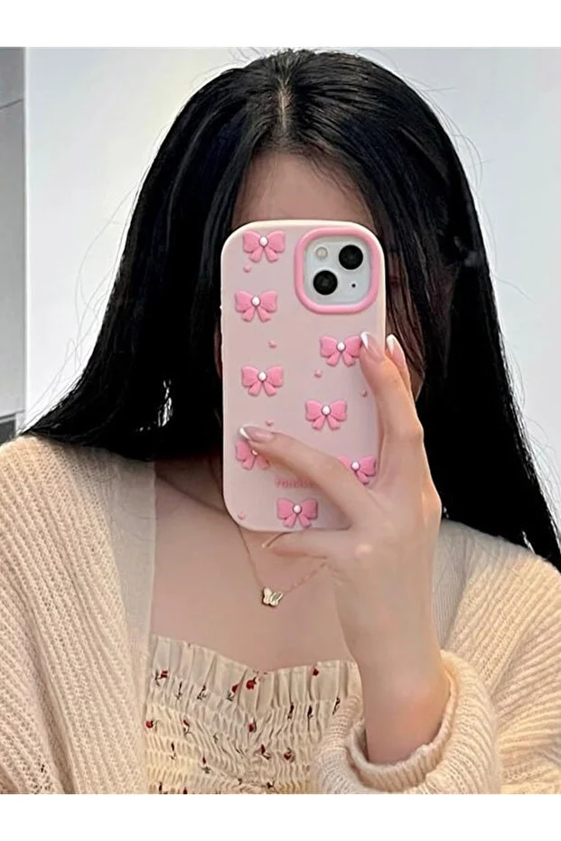 جراب KVK PRIVACY من السيليكون الناعم المتوافق مع iPhone 13 / 14 / 15 بنقوش فيونكة وردية