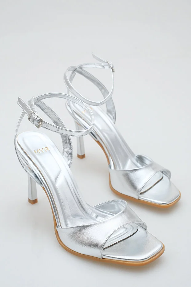 حذاء ميرا: حذاء نسائي فضي لامع بكعب عالٍ وحزام للكاحل