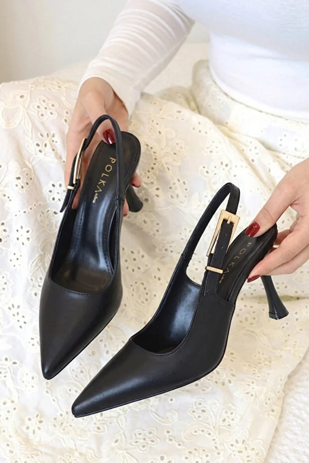 حذاء نسائي بكعب عالٍ مدبب من الأمام مزين بإبزيم معدني ذهبي اللون