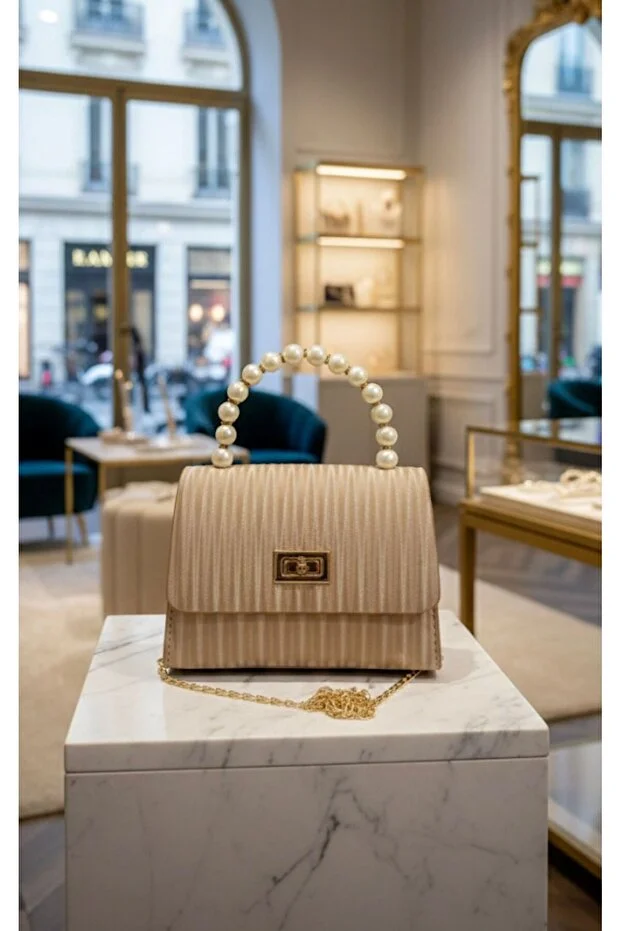 حقيبة يد صغيرة من آدي، بنقشة مخططة بيج، مزينة باللؤلؤ، وحزام سلسلة ذهبية، E18 B12