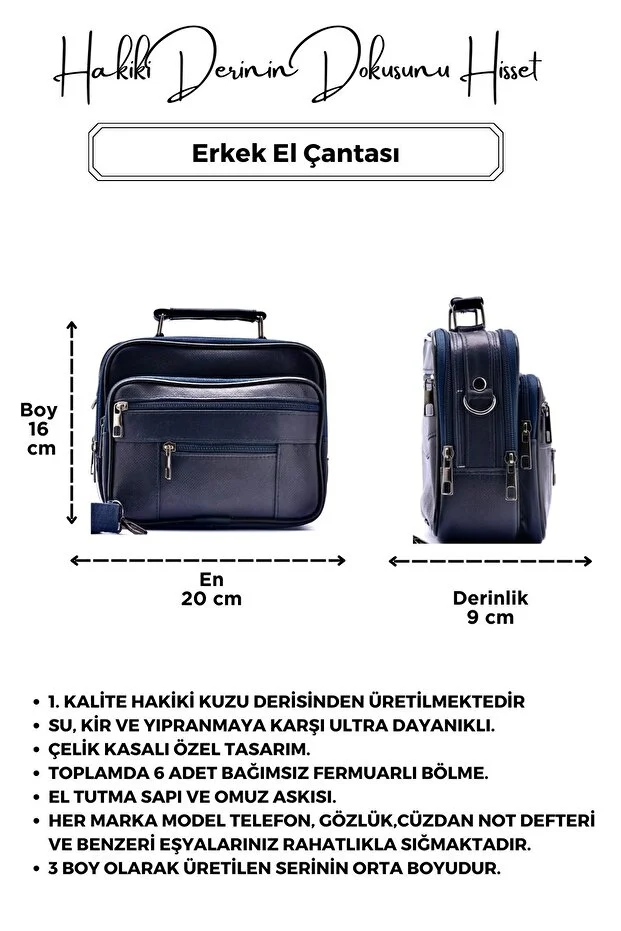 0 Review Of Product حقيبة يد وكتف رجالية من CüzCan باللون الأزرق الداكن، بتصميم أفقي، مصنوعة من الجلد الطبيعي، بهيكل فولاذي (مقاس متوسط)