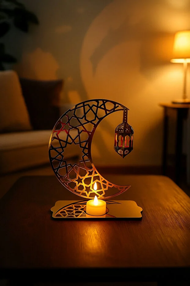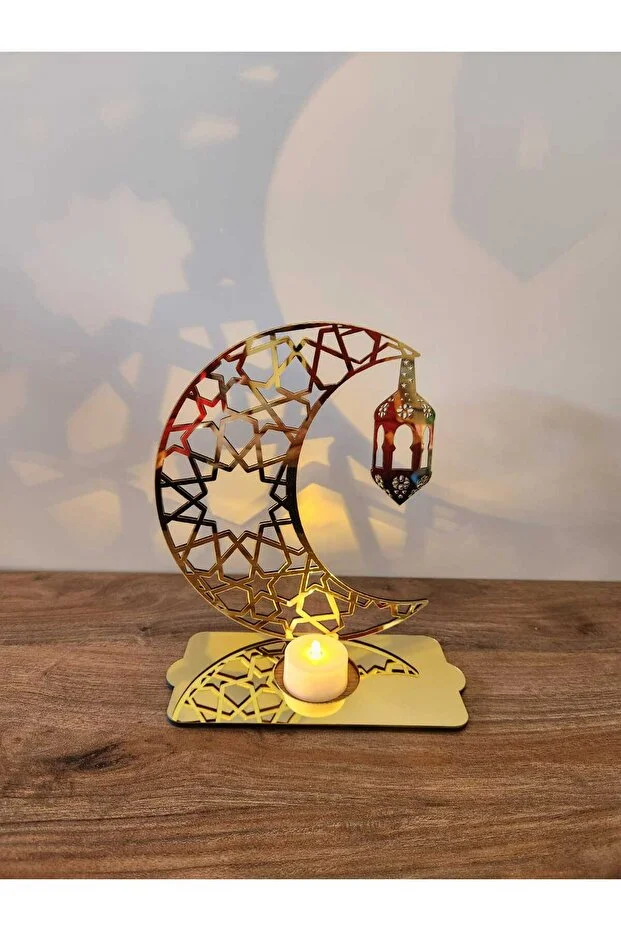 زينة رمضان من ALSHOP، حامل شموع عاكس مزخرف مزدوج الجوانب بنمط سلجوقي، مطلي بالذهب/الأسود، بإضاءة خلفية ذهبية/سوداء