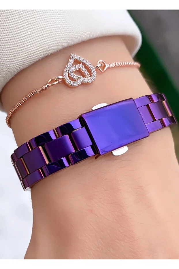 ساعة فيروتشي النسائية - ميناء بنفسجي، سوار فولاذي من الذهب الوردي، تصميم بسيط مع أحجار، سوار هدية