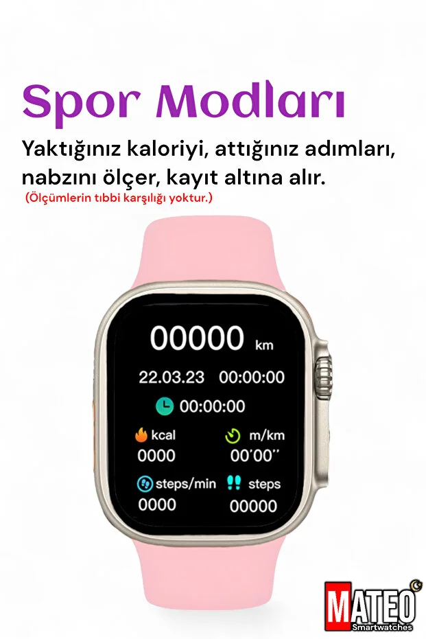 ساعة MATEO T900 ULTRA الذكية باللون الوردي، مقاس 49 مم، مزودة بتقنية بلوتوث، وخاصية الاتصال، ومستشعر صحي، ومتوافقة مع نظامي iOS وأندرويد.