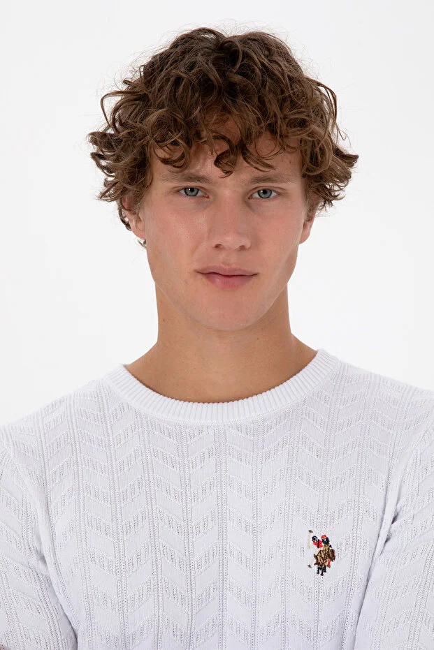 سترة رجالية بيضاء منقوشة من يو إس بولو أسن، بقصّة Slim Fit ورقبة دائرية