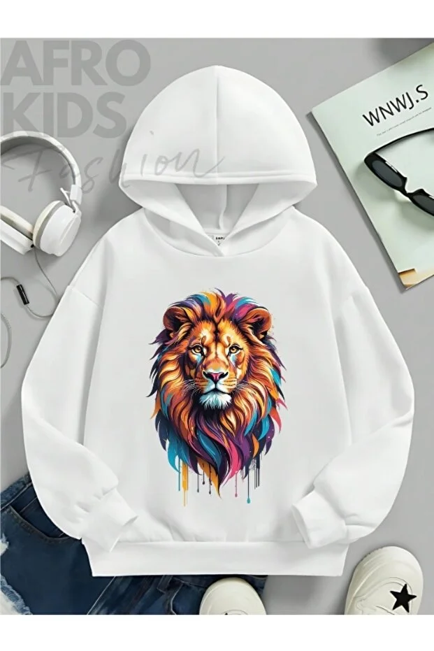 سويت شيرت بغطاء رأس للأطفال من الجنسين، مصنوع من القطن ثلاثي الخيوط، مزين بطبعة أسد