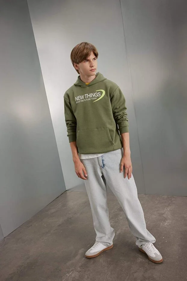 سويت شيرت بغطاء رأس للأولاد من ديفاكتو، لون كاكي، مع طباعة خلفية وجيوب C9789A824AU