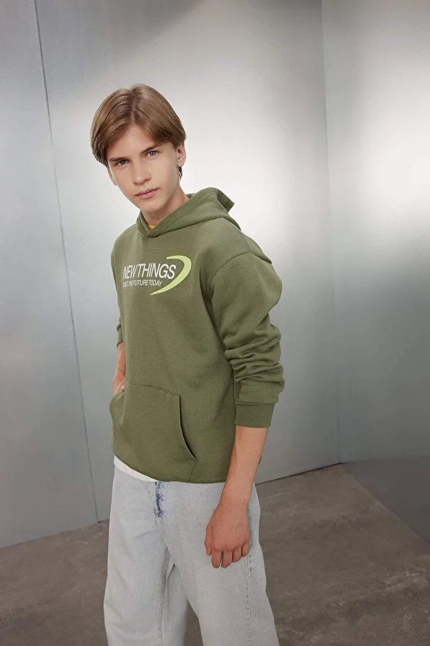 سويت شيرت بغطاء رأس للأولاد من ديفاكتو، لون كاكي، مع طباعة خلفية وجيوب