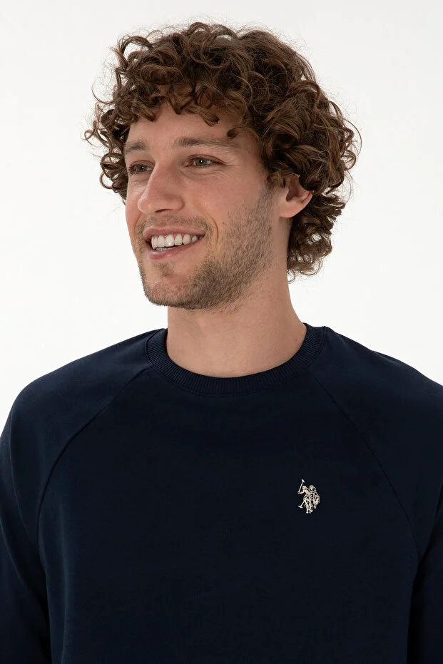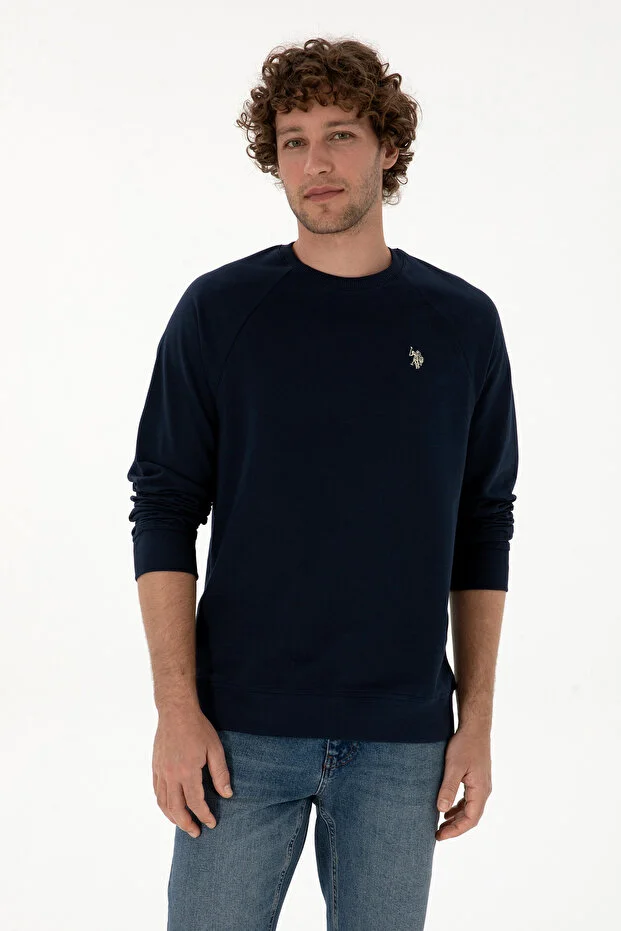 سويت شيرت رجالي من يو إس بولو أسن، بقصة عادية وياقة دائرية، أزرق داكن، رفيع، أساسي