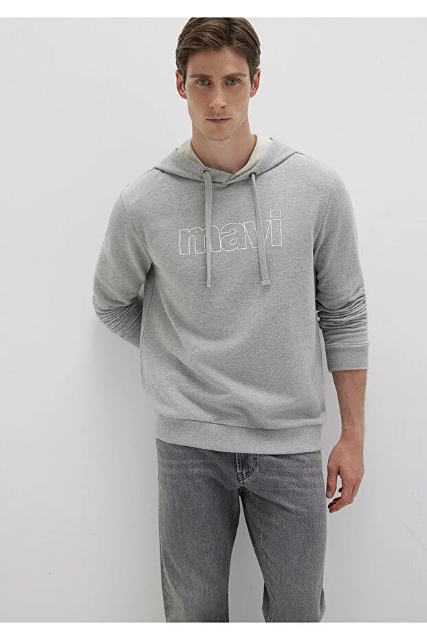 سويت شيرت رمادي بغطاء رأس ومطبوع عليه شعار أزرق