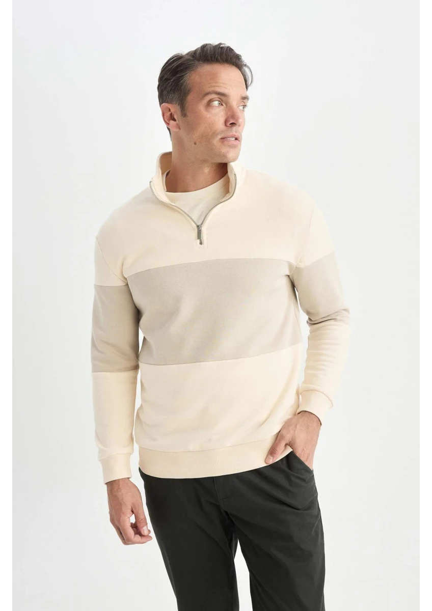 سويت شيرت سميك مخطط بقصة عادية مريحة من DeFacto Comfort، بياقة واقفة وسحاب أمامي