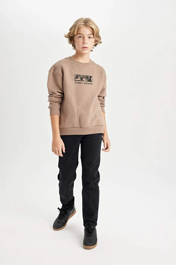 سويت شيرت Defacto للأولاد، مقاس كبير، فضفاض، مطبوع من الخلف، بياقة دائرية