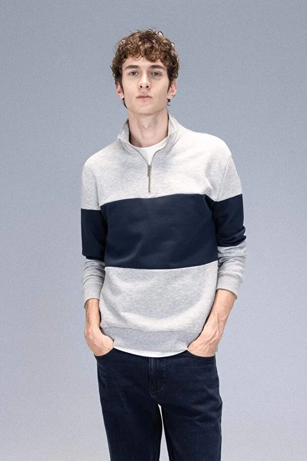 سويت شيرت Defacto Comfort ذو قصة عادية وقصة مريحة وياقة قائمة وسحاب ومخطط سميك