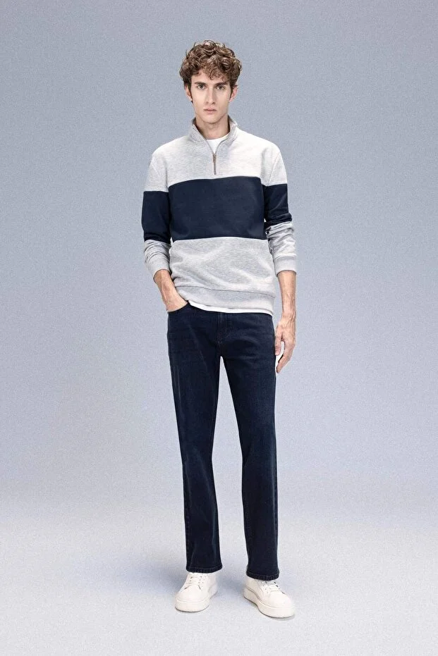 سويت شيرت Defacto Comfort ذو قصة عادية وقصة مريحة وياقة قائمة وسحاب ومخطط سميك