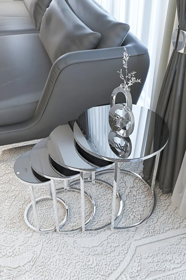 طاولة قهوة بوكلايف سيلين المتداخلة المكونة من 4 قطع بأرجل معدنية فضية ومرآة مدخنة