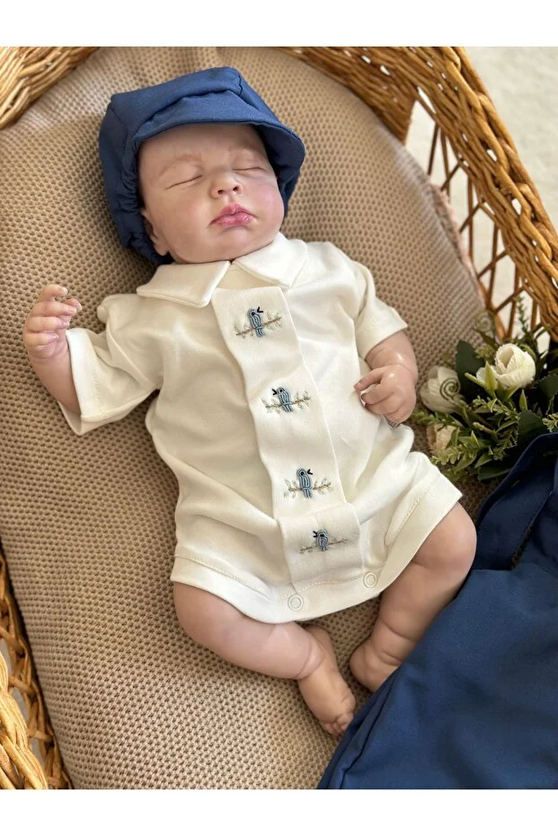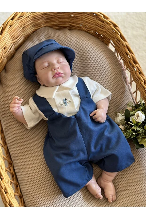 طقم بدلة جسم وقبعة من ماما ميل، أزرق داكن، مصنوع يدويًا