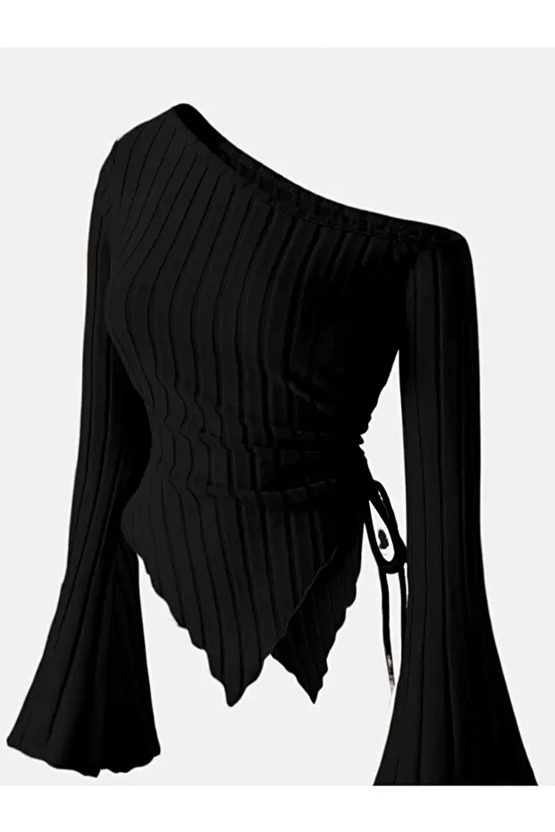 طقم بلوزة سوداء مضلعة غير متماثلة بكتف واحد وأكمام رفيعة وبنطلون واسع الساق بخصر مرتفع من Wild Flower