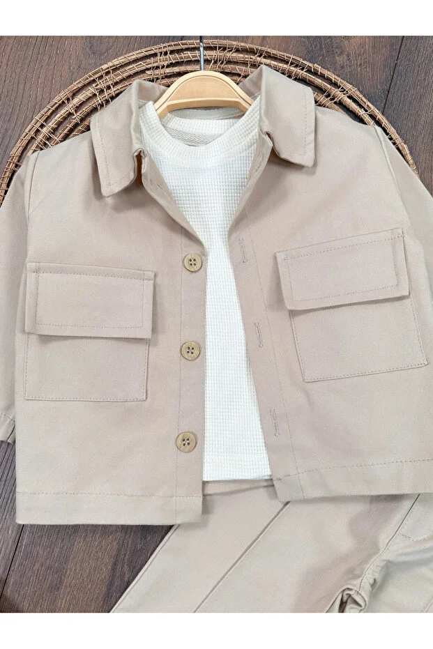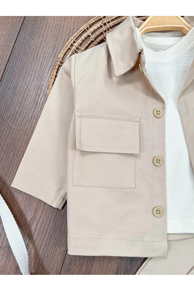 طقم بولي بيبي سفاري من 3 قطع، سويت شيرت من الكتان والليكرا، مزود بزر كبس على الكتف، للأولاد والبنات