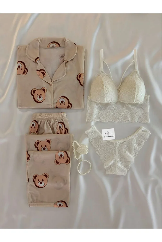 طقم بيجامات وملابس داخلية بأكمام طويلة من MH Moony Homewears، مكون من 4 قطع، على شكل دب لاتيه
