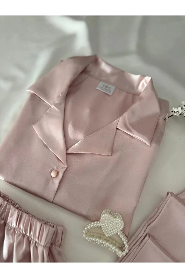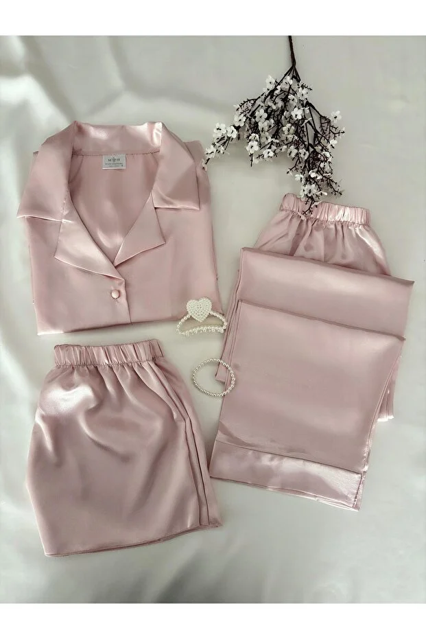 طقم بيجاما من الساتان الوردي الفاتح مكون من 3 قطع من إم إتش موني هوم ويرز
