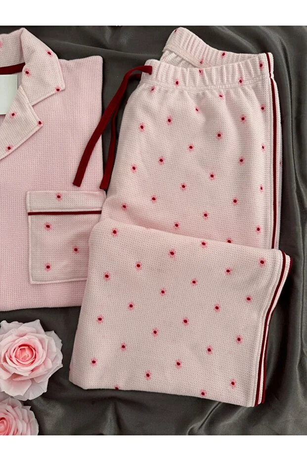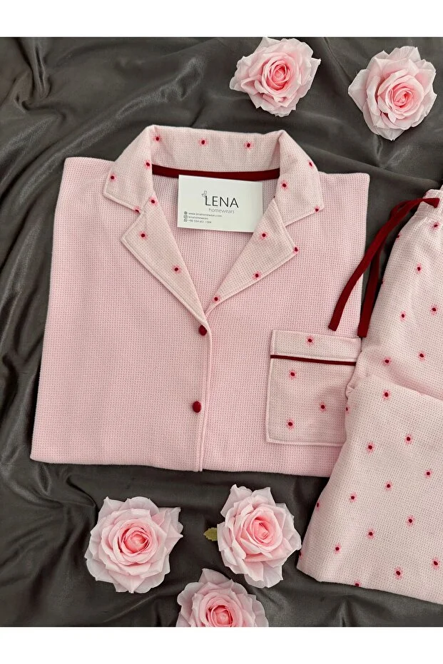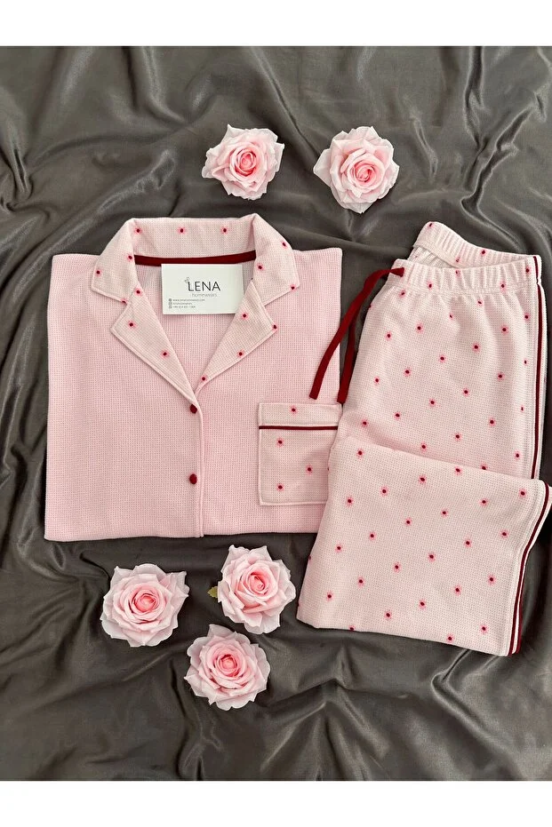 طقم بيجامة فاخر من Lena Homewears بنقشة زهور وردية ونقشة وافل وردية