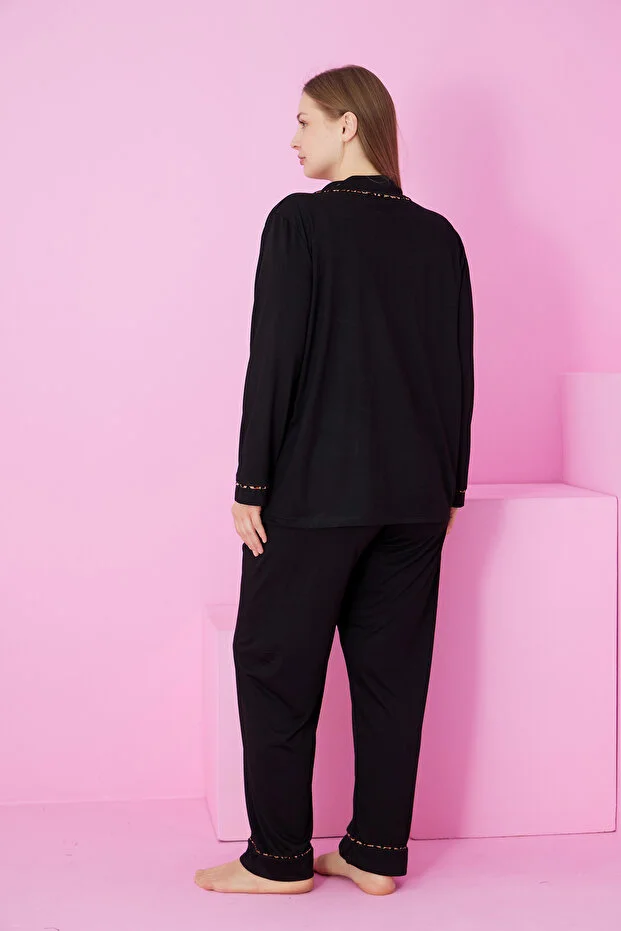 طقم بيجامة من الفيسكوز بأكمام طويلة وياقة قميص سوداء مطرزة بنقشة جلد النمر وأزرار ومقاس كبير