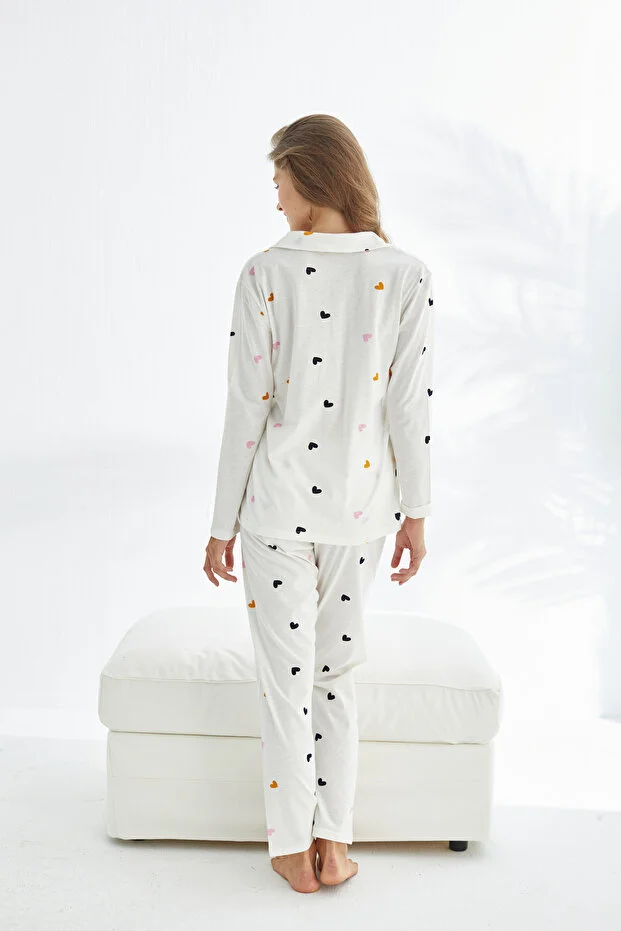 طقم بيجامة من القطن الأسود اللؤلؤي والأبيض بنقشة قلب وأزرار