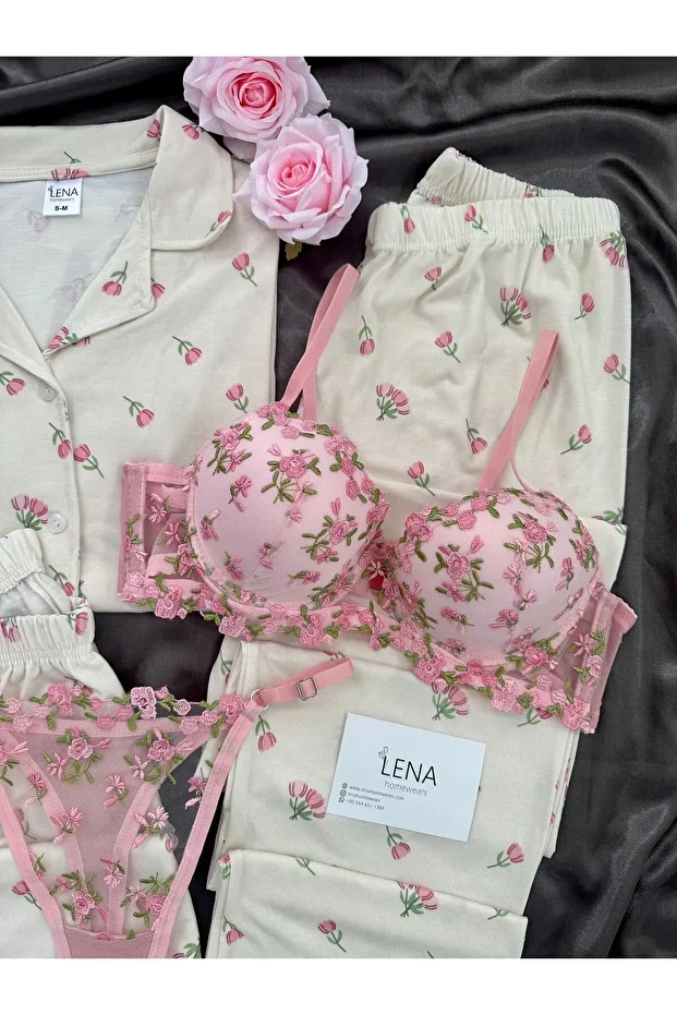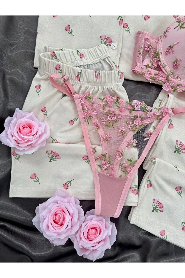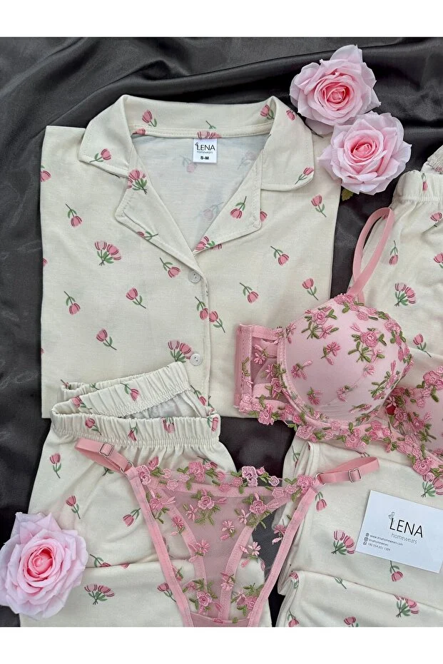 طقم بيجامة نسائية من Lena Homewears، مكون من 5 قطع، ملابس داخلية قصيرة، وشورت، وساقين طويلتين، وأكمام قصيرة، بنقشة توليب، من Rozaline