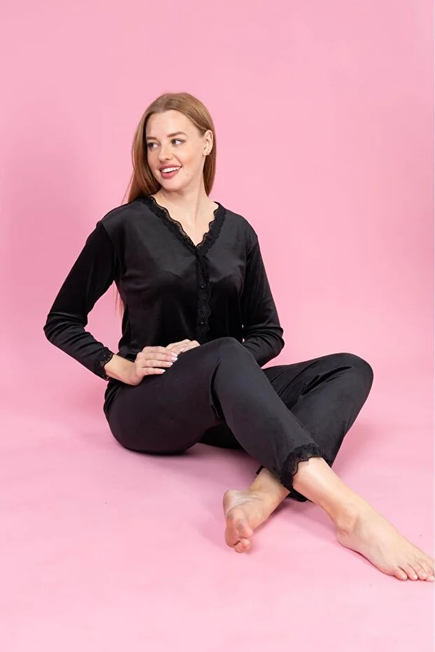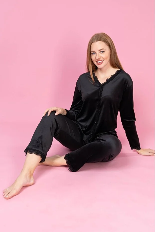طقم بيجامة نسائية من Meba، مخملية، بأزرار أمامية، وياقة دانتيل، لون أسود، GN-255