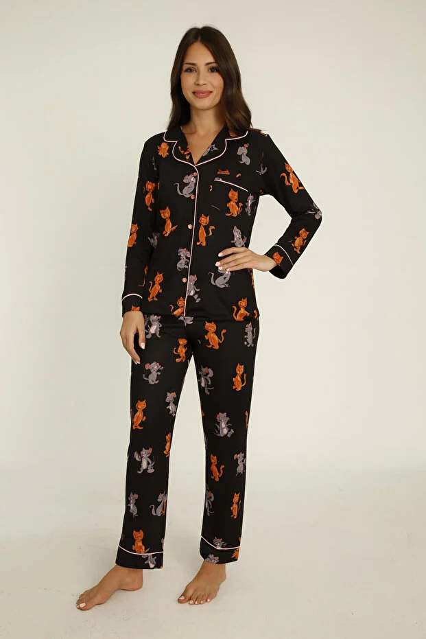 طقم بيجامة نسائية من Miss World Lissa Black Cat بنقشة وأزرار أمامية وقميص