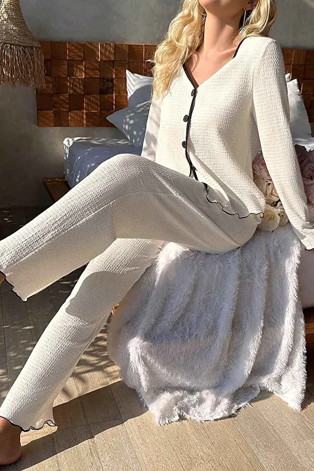 طقم بيجامة Merry See الخاص المصنوع من القماش المحبوك والأزرار بأكمام طويلة